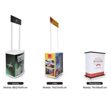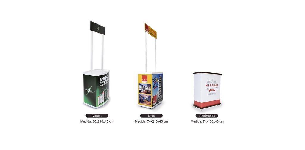 Ele pode ser utilizado sozinho ou combinado com backdrops retráteis e banners roll up, criando um conjunto completo de comunicação visual.