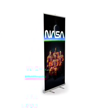 O banner roll up, também conhecido como banner retrátil, é um display portátil composto por uma estrutura em alumínio com sistema retrátil interno. A arte gráfica fica enrolada dentro da base e é puxada para cima no momento do uso, ficando tensionada por uma haste.