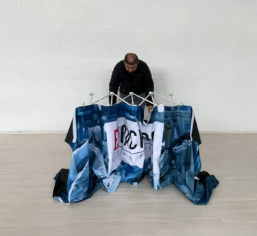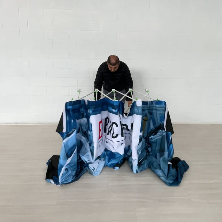 Soluções portáteis em comunicação visual para eventos, desenvolvidas para destacar sua marca com praticidade, montagem rápida e alto impacto visual